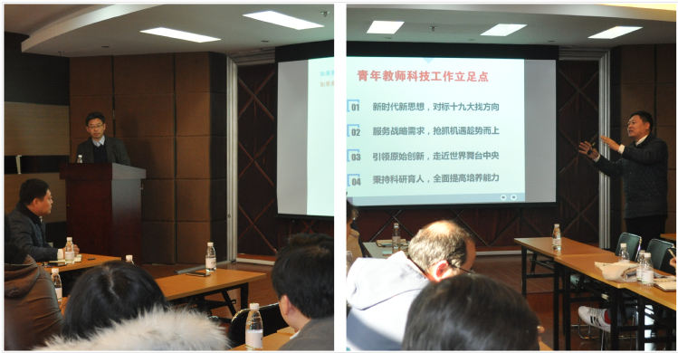 随后,学院科研副院长赵黎明对学校和学院科研形势、问题和对策为大家做了详细的介绍和分析,并结合学院实际情况就新形势下科研工作如何对标党的十九大找方向、服务战略需求抢抓机遇趁势而上、进行原始创新引领国际科技前沿、秉持科研育人提高人才培养水平四个角度进行了剖析。同时,对青年教师如何准确定位、积极有效地获得科研项目、如何快速成长等问题和大家进行了深入交流,帮助青年教师树立科技工作立足点,积极推动青年教师与企业合作,鼓励大家释放科研热情,也就2018年学院科研工作安排对大家提出了新的要求。