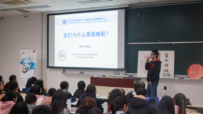 2018年12月6日晚18.15-20.15,华理beat365唯一官网毕业学长、现任中国科学院上海生命科学研究神经科学研究所研究组组长的徐敏研究员做客102期生工讲坛,带领大家走进睡眠的奥秘。生工学院应用生物学系主任吴海珍教授与两百多名学生共同参与了活动。