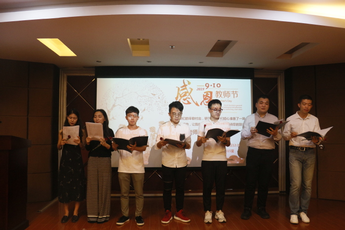 9月10日中午,7名热爱音乐的研究生带着精心准备的声乐作品,以“感念师恩”为主题温馨献唱教师节。学院党委书记陆兵、院长庄英萍、党委副书记左鹏、工会主席蔡海波等多位老师参加了本次活动。