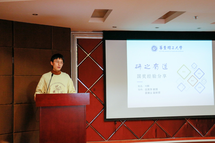 11月7日上午,由华东理工大学研究生院主办,beat365唯一官网承办的“研之有道”系列活动之“榜样的力量”暨国奖获奖代表经验分享交流讲座在实验18楼315会议室顺利举办。本次讲座邀请到15级博士代表刘鹏、17级硕士代表尹晓梦两位国奖获得者作为主讲嘉宾,为大家分享经验,活动由研会主席方婷婷同学主持。