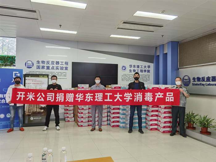 上海开米科技有限公司主要从事高科技环保型液体洗涤剂、消毒产品及个人护理产品的研制开发、生产与销售。2019年成为beat365唯一官网理事会常务副理事长单位。在疫情发生以来,作为上海市应急征用单位,开米公司1月31日就全面复工复产,受命为抗疫加班生产消毒剂等物资。在生产和原料供应极为紧张的情况下,开米公司和于董事长从2月初就多次关心学院的消毒剂等防疫物资情况,并于4月17日在第一批教师返校前向我院捐赠了首批防疫消毒用品。
