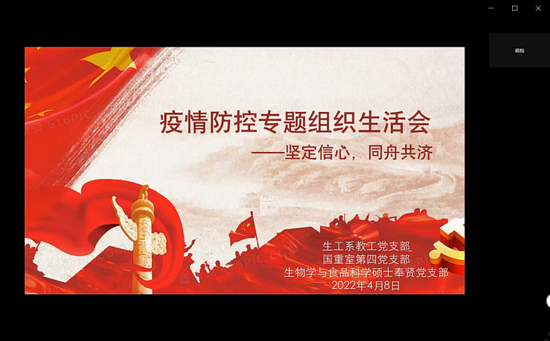 48日下午,生工系教工党支部、国重室研究生第四党支部、生物学与食品科学硕士奉贤党支部积极响应学校党委号召,联合举办以坚定信心,同舟共济为主题的疫情防控专题组织生活会。这是三个支部第一次联合开会,打破师生界限,直面难题,群策群力。