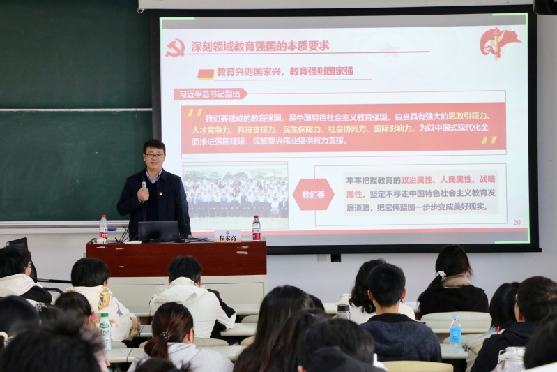 程家高带领全体同学深入学习了习近平总书记在全国教育大会上的重要讲话精神。他强调,要把学习习近平总书记重要讲话精神与学习党的二十届三中全会精神结合起来,要准确把握核心要义,深刻领会精神实质。习近平总书记的重要讲话系统阐释了教育强国的本质要求和实现教育强国的战略任务和重大举措,为教育强国建设指明了方向。他指出,华理学子要深刻认识到时代机遇和使命责任,传承“学在华理,铸就卓越”的精神,努力提升综合素质,锐意进取、挺膺担当,用实际行动践行全国教育大会精神,为加快建设中国特色社会主义教育强国贡献青春力量。